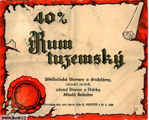 cz2656: 40%; Rum tuzemský; Středočeské lihovary a drožďárny, národní podnik, závod lihovar a likérka Mladá Boleslav; Povoleno min. pro zás. lidu čj. 10292/2757 z 30.3.1923; NARPA 222